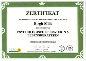 - Zertifizierte psychologische Beraterin / Lebensberaterin, Ausbildung bei Sandro Hänseroth (Isolde Richter Naturheilschule), 2024-2025.