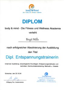 Diplom-Ausbildung an der Body & Mind Akademie, München, 2003. - Weitere Fortbildungen der letzten Jahre waren unter anderem: